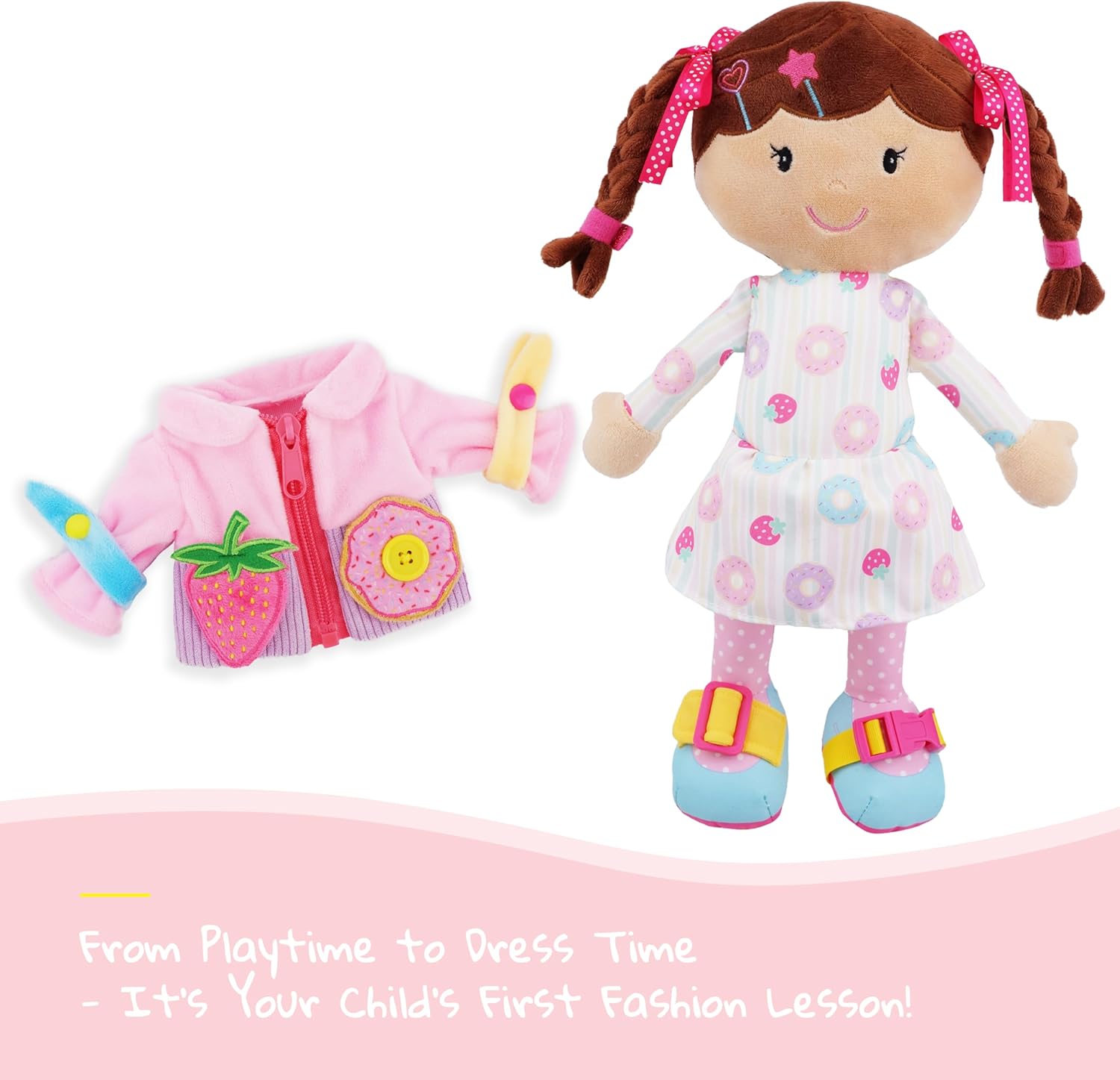 Great for Ages 3 and up develop fine motor skills and learn how to zip, fasten, Velcro, buckle, unbutton, and tie a bow.