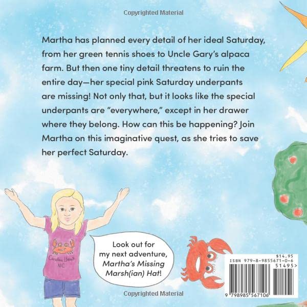 Martha has planned every detail of her ideal Saturday, from her green tennis shoes to Uncle Gary’s alpaca farm. But then one tiny detail threatens to ruin the entire day—her special pink Saturday underpants are missing! Not only that, but it looks like the special underpants are “everywhere,” except in her drawer where they belong. How can this be happening? Join Martha on this imaginative quest, as she tries to save her perfect Saturday.