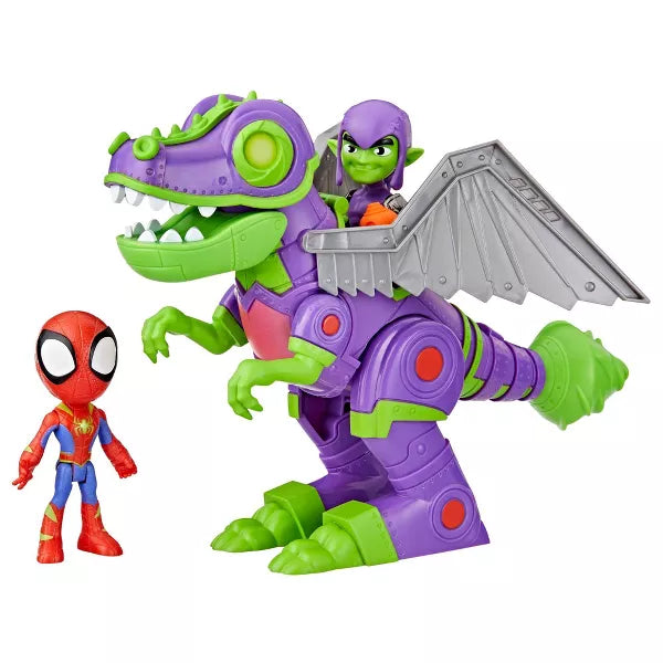GOBLINSAURUS MECH SUIT WITH ACCESSORIES: Dino Mech includes attachable wings and 2 projectiles. Spidey and Green Goblin figures also fit inside!