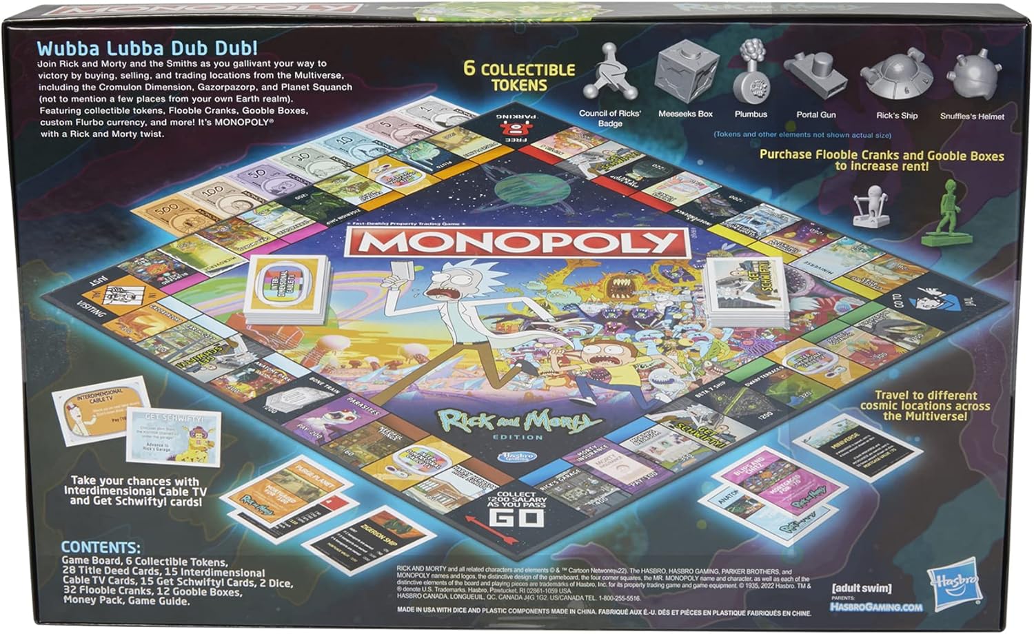 - MONOPOLY GAME INSPIRED BY RICK AND MORTY: In this edition of the Monopoly board game for 2-6 players, you gallivant to victory as you buy, sell, and trade locations from the Rick and Morty Multiverse