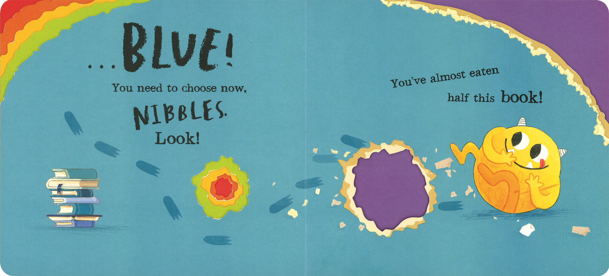 Red and yellow and pink and... CHOMP! Uh-oh! Nibbles the book monster has munched his way into a book of colors! Can you catch him before it’s too late? Board book. 20 Pages. Ages 1 to 3.