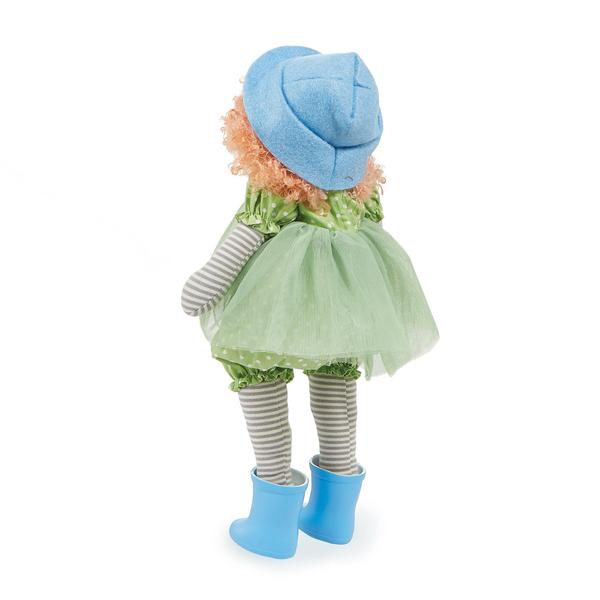 Rosie features a kind smile on her embroidered face framed with a darling blue soft felt hat, atop her wild pink curls! Rosie comes with a two-piece outfit in spirng green polka dot bloomers with a tulle skirt on top, ready to twirl, and perfectly matching her darling blue boots. Soft and huggable body with grey and white knit stripe legs and arms are perfect for snuggling.